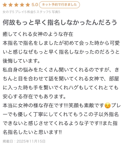 口コミありがとうー!何事もタイミングですからね、今出会えたことに感謝ですよ♡ふふ、自分だって丁寧にしてもらったほうが気持ちいいからそうしてるけど気づいてくれて嬉しいー!これからもたくさん気持ちよくなってね꒰ᐡ• ‧̫ •ᐡ꒱⊃✨りこはお話聞くの得意だから、りこに話してスッキリするならいつでもなんでも話してねまたまってるよー!りこ