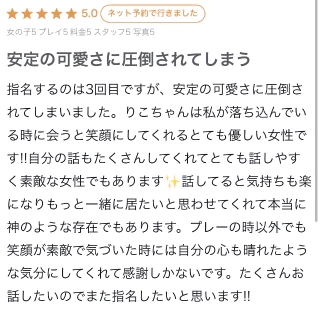 クチコミありがとうー!いつもありがとーね^ ̳⩌ ̫ ⩌ ̳^♡最初の頃より仲良くなれて嬉しいんだ〜あんまりおしゃべしてくれなかったのに、最近はよくしゃべってくれる♡お仕事いつもお疲れ様ね!今月も楽しもうね〜りこ