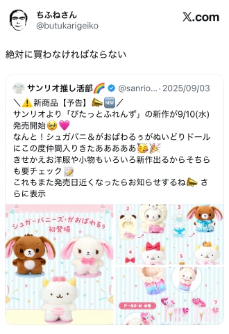 先日リツイートした奴です。買いました。迎え入れました。シュガーバニーズのお顔を、沢山吟味しているお姉さんを少し申し訳なく思いつつ、私も、ぱわを選ばせてもらいましたな。なんか、ぬいぐるみってさ、使わないから、ちょっと買おうか悩んだんですよね。せっかくだから、メガパのお部屋に鎮座させようかなと思います。でも…、愛くるしいぱわに人間のまぐわいなんな見せたら可哀想かな…。