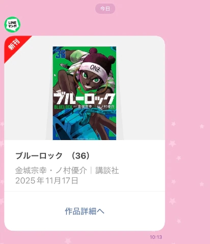 ふと自分のLINEに、LINEマンガの新着漫画の通知が届いてて、開いてみたら“ブルーロック36”という文字が見えました✨これは買うしかない…!!!退勤したら買います!読みます!今日の夜の楽しみが出来たー✨✨てかあれですね、5巻くらい前に戻って読まなきゃまた話わからなくなるやつだリオナ