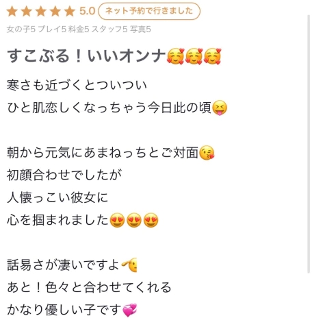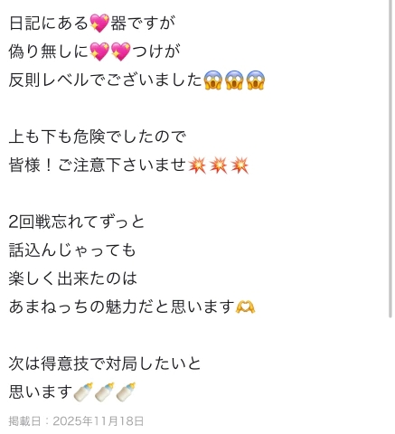 素敵なありがとうございます!褒め言葉ばかりで嬉しい♡トークも楽しすぎてついつい……(この私が一度きりで終わるなんて……レベル)回数≠満足だと思ってるので良かったです次は絶対回数‼️お願いいたします‼️@h__Amanechan