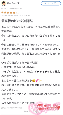 まぁくんどすさん✨️いつも気にかけてくれてありがとうまぁくんにお会いするのも久しぶりだし、まぁくんに口コミ書いてもらえたのも久しぶりですね会えたことにまず嬉しかったです(*´`*)どこにいてもまこちー♡♡頑張りますので今後とも応援の程よろしくお願いします❣️✨️お〇パイの前では子供のようにはしゃいでくれるまぁくんにキュンキュン️しちゃいましたꯁꯧこれからも仲良くして下さいまた会える日をとっても楽しみにしてます★及川真琴★
