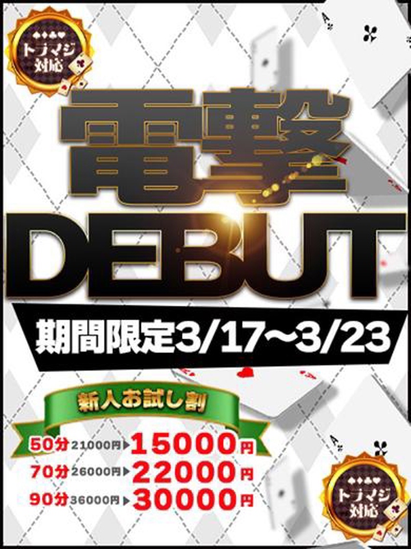 *☆*――*☆*――*☆* 【新人お試し割】 ◆50分15000円(指名料込) ◆70分22000円(指名料込) ◆90分30000円(指名料込) *☆*――*☆*――*☆* 期間限定(3/17~3/23) *☆*――*☆*――*☆* トランプマジック対応 *☆*――*☆*――*☆* \\超に超がつく細身爆乳の極上パイ// さぁ召し上がれと言わんばかりの~ 最強BODY!!!!!!!!!!! 思わず指先が…舌先が…伸びて… 生唾ごっくん!!!!!!!!!!! 若さ弾ける♡パイも弾ける♡ スレンダー美少女【あい】ちゃん♡ 期間限定電撃デビュー(^o^)/ 愛嬌たっぷりの元気なおもてなしに♡ 笑顔になっていただけること間違いなし♪ 出会った瞬間に長年の知人かと 思ってしまうほどの人懐っこさにキュン♡ それでいてねっとりと 濃厚なえちえちご奉仕にキュン♡ キュンキュンポイントに勃ちまち大興奮!!! 顔☆☆☆☆☆ 胸☆☆☆☆☆ 体☆☆☆☆☆ 愛嬌☆☆☆☆☆ えち☆☆☆☆☆ オール満点☆5!!!!! 最強美少女をお見逃しなく!!!!! 以上です(__) 【注意】M〇トはご遠慮ください!ルールとマナーを【絶対に守って】お楽しみください!