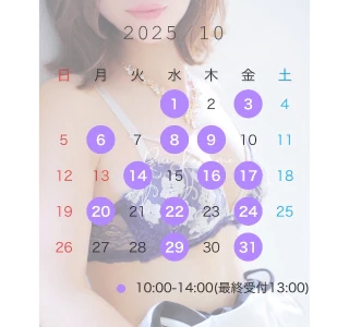 あなた様の体温が恋しくなる秋寒さをかんじたらギュッと寄り添えるような自然な関係になれたらいいなぁなんてそんな10月の出勤日はこちら⬇️すでに予約で埋まっている日があるのでご注意ください⚠️そして、姫予約の特典についてはまだ考え中なので明日あたりにお知らせできたらなと思っています!その他、空き状況などの質問はLINEからお問い合わせください✅
