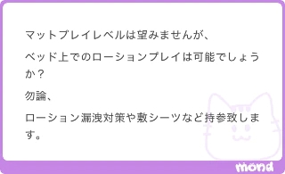 最近mondから通知がこなくて返信が遅くなっていたらごめんなさいMッドプ◯イレベルでなくてOKかつシーツ持参ということならやりましょうA▽のようなプ◯イができて楽しいかもしれませんねただ、準備・片付け等を考えたら100分〜が目安になるのでご検討よろしくお願いします