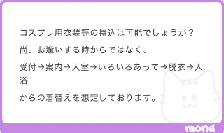 mondからの質問ありがとうございます❤️新品であれば、持ち込みコスプレ可能です持ち込みだと自分が普段選ばないようなコスプレを着ることができるのでワクワクしてしまうんですよね☺️「いろいろあって」も何があるのかなぁ私もいろいろさせてください