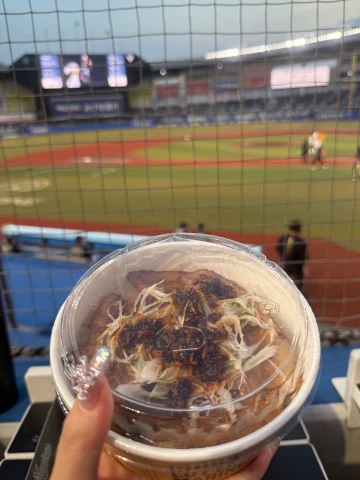 冷やしラーメン!あんまり普段冷やしは食べないけど暑くて気になってチョイスしたんだけど、食べやすい唐揚げ?に大根おろしとレモンついてて暑い夏の球場グルメにぴったり
