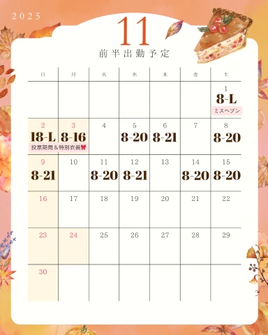 11月後半の出勤予定は11/10頃に
